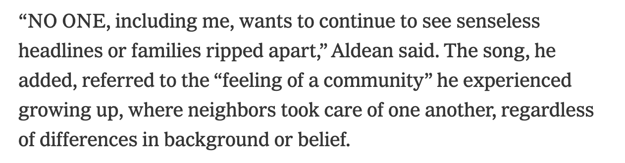 It wouldn’t be fair to give my opinion on Jason Aldean because I don’t listen to his music or know anything really about him. All I can assess is the song, the video, and his response which, when faced with criticism that his video came off as lynchy and that images used in his video have a complicated history, was to clarify…